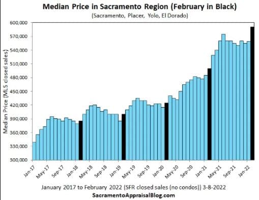 In exactly a month, January 2022 to February 2022, the median price increased $31,000 in Sacramento. This essentially means that homes appreciated $1,000 per day. I don’t know many investment classes that are currently bringing these returns.