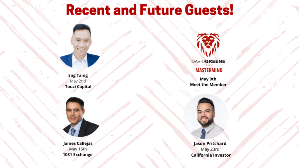 The David Greene Team Mastermind has kicked off the month of May with some fantastic guest speakers! Tap into the mastermind to gather some more information on 1031 exchanges, investing in crypto and hear our members share about their recent deals!