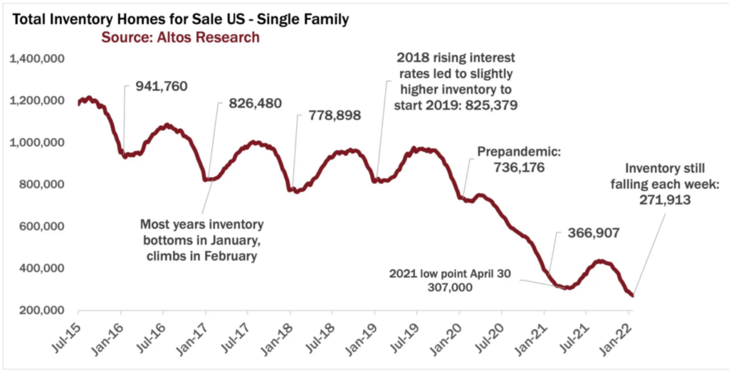 As of January 2022, inventory continued to fall nationwide. This is one reason why we’re seeing such tough competition for buyers, multiple offers, and offers being accepted well above asking price.
